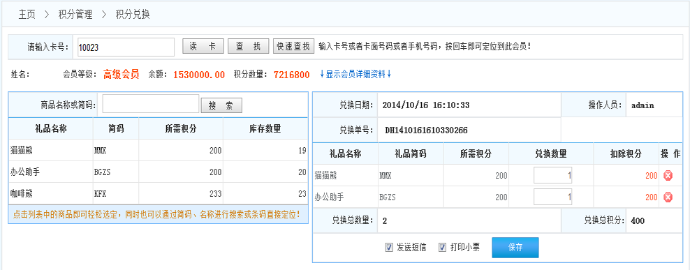 1.發(fā)送短信:如果系統(tǒng)開(kāi)啟了短信功能,在完成兌換后系統(tǒng)會(huì)自動(dòng)給該會(huì)員發(fā)送通知短信,告知會(huì)員兌換信息?。ㄩ_(kāi)啟短信功能在 增值服務(wù)》服務(wù)參數(shù)》短信參數(shù)設(shè)置(對(duì)短信進(jìn)行參數(shù)設(shè)置))