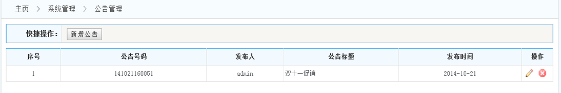 2.公告列表:在公告列表的操作一欄 可以對改公告進(jìn)行修改和刪除的操作