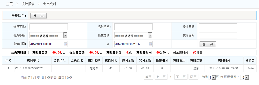 會員充時統(tǒng)計: 1.導(dǎo)出:將按條件查詢到的數(shù)據(jù) 導(dǎo)出成Excel表格 2.會員充時統(tǒng)計:這里顯示了本店鋪的充時概況 3.查詢:按照條件查詢出數(shù)據(jù)(例如根據(jù)會員的店鋪會員的等級等)
