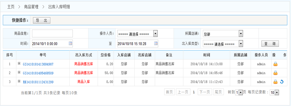 出庫入庫明細(xì):點(diǎn)擊進(jìn)入出庫入庫明細(xì)界面 如下圖: 此界面顯示出庫入庫的明細(xì)數(shù)據(jù),支持按訂單號/商品名稱快速查找,按時間范圍、操作員、所屬店鋪過濾條件查找