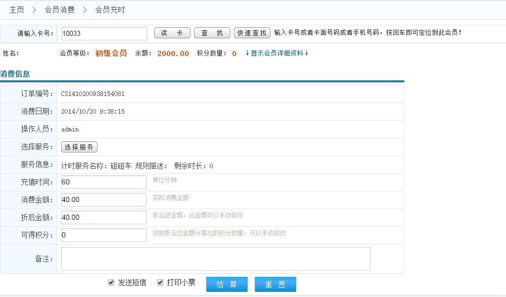 點(diǎn)擊選擇服務(wù)按鈕,選擇會(huì)員充時(shí)的計(jì)時(shí)服務(wù),然后輸入充時(shí)的時(shí)間,系統(tǒng)將自動(dòng)通過選擇的服務(wù)的規(guī)則計(jì)算出消費(fèi)金額、可得積分等數(shù)據(jù)并自動(dòng)填充